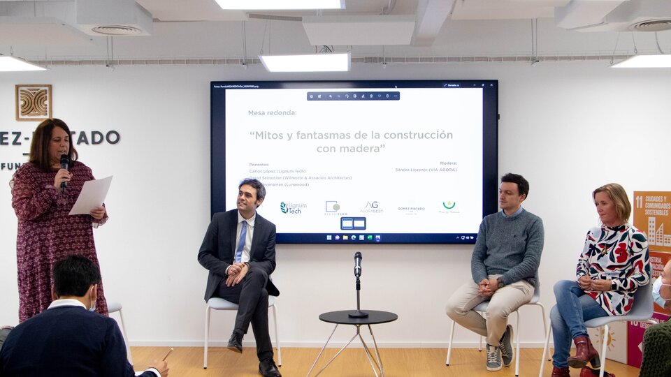 Durante la mesa redonda “Mitos y fantasmas de la madera en la construcción”, se contó con la presencia de Carlos López, exestudiante del Grado Inmobiliario, David Sebastián, Director de proyecto en Wilmotte & Associés Architectes y Julia Ahvenainen, International Marketing Manager en Lunawood. El debate fue moderado por Sandra Llorente, Directora General en Lignum Tech y Rehabiterm.